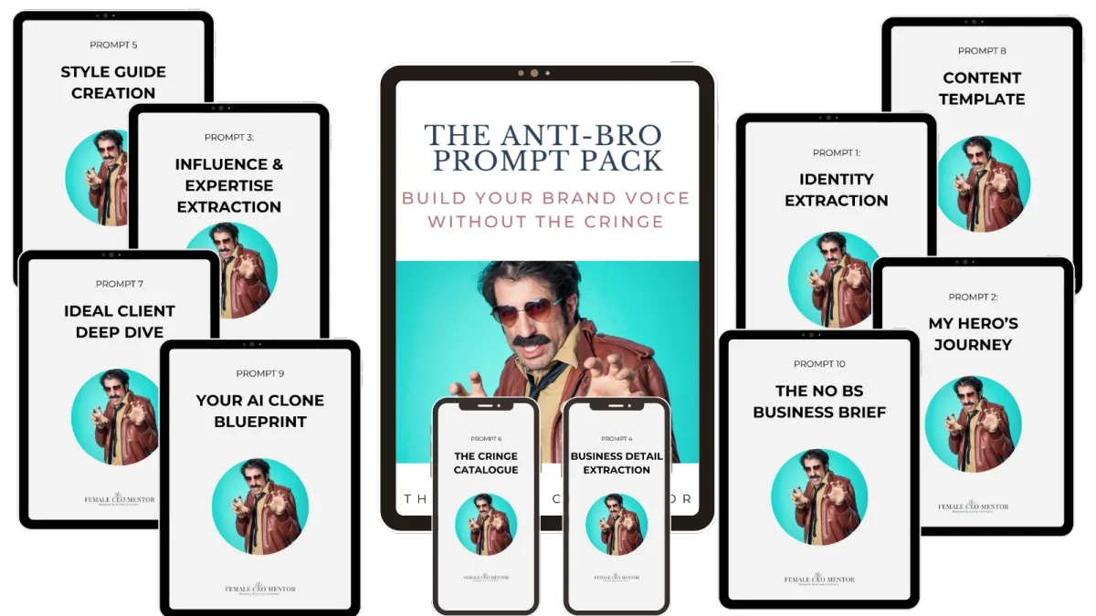 The Anti-Bro Prompt Pack™ gives you 10 carefully crafted ChatGPT prompts that make writing fresh, authentic, non-sleazy content stupidly simple.